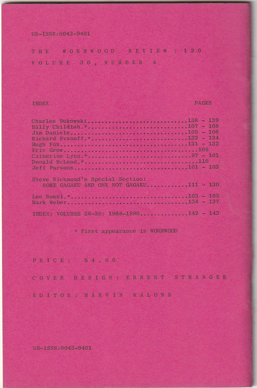 Charles Bukowski always felt Wormwood Review was the best small magazine out there and was grateful that they were one of the first to recognize his work. In return, Bukowski continued to contribute to the magazine right up until his death in 1994.