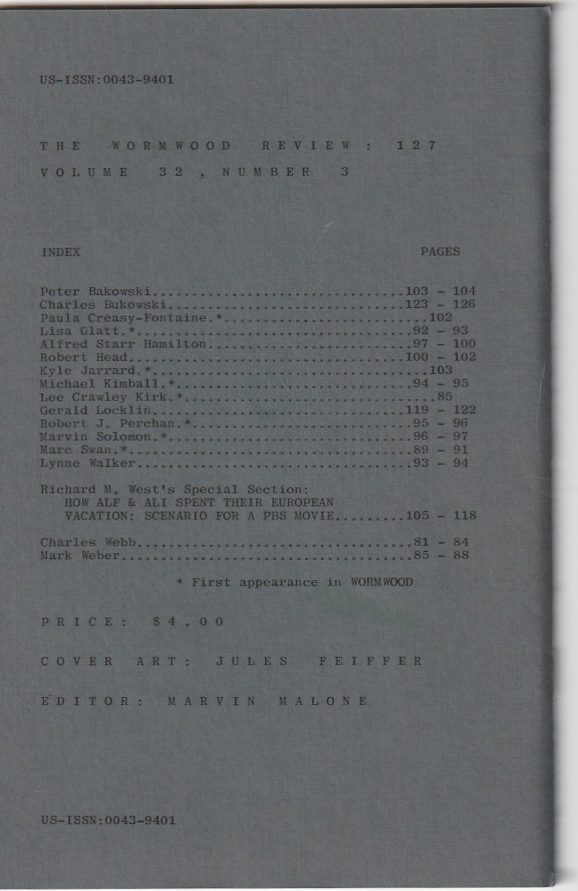 Charles Bukowski always felt Wormwood Review was the best small magazine out there and was grateful that they were one of the first to recognize his work. In return, Bukowski continued to contribute to the magazine right up until his death in 1994.