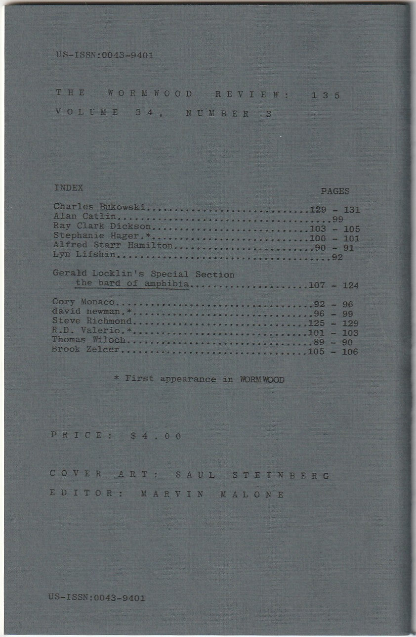 Charles Bukowski always felt Wormwood Review was the best small magazine out there and was grateful that they were one of the first to recognize his work. In return, Bukowski continued to contribute to the magazine right up until his death in 1994.