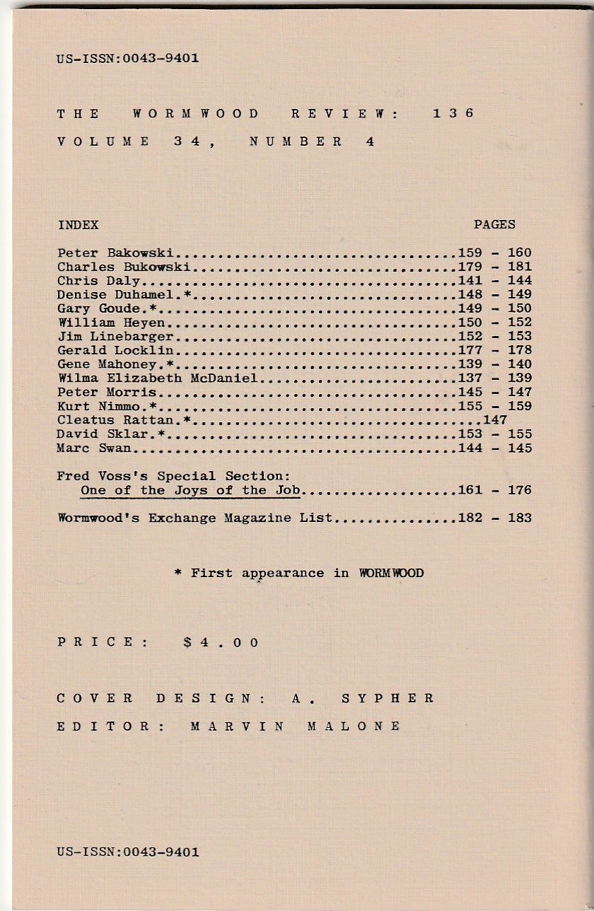 Charles Bukowski always felt Wormwood Review was the best small magazine out there and was grateful that they were one of the first to recognize his work. In return, Bukowski continued to contribute to the magazine right up until his death in 1994.