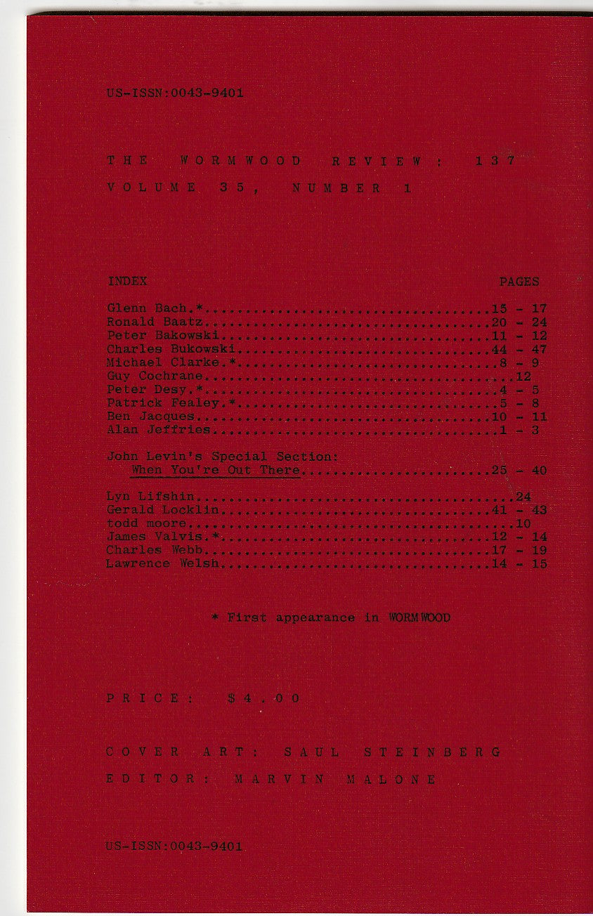 Charles Bukowski always felt Wormwood Review was the best small magazine out there and was grateful that they were one of the first to recognize his work. In return, Bukowski continued to contribute to the magazine right up until his death in 1994.
