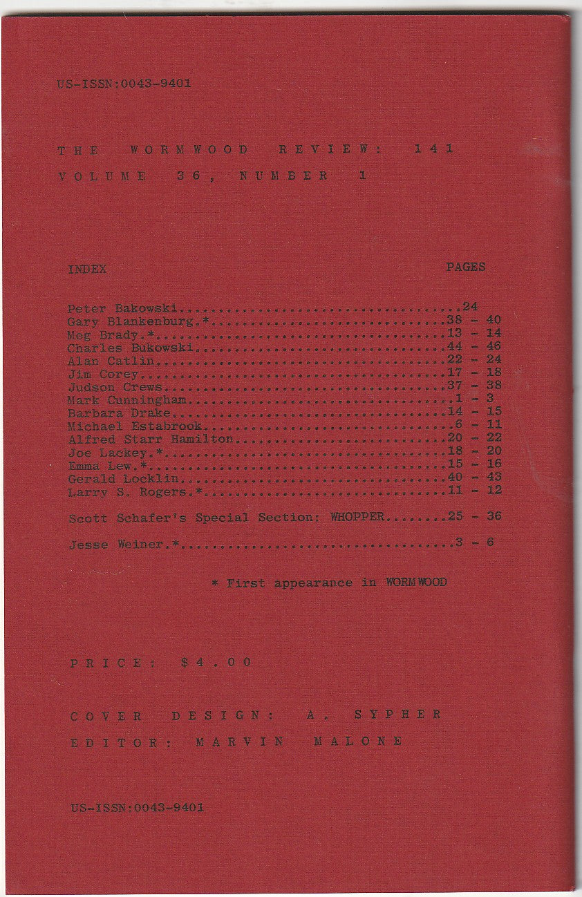 Charles Bukowski always felt Wormwood Review was the best small magazine out there and was grateful that they were one of the first to recognize his work. In return, Bukowski continued to contribute to the magazine right up until his death in 1994.