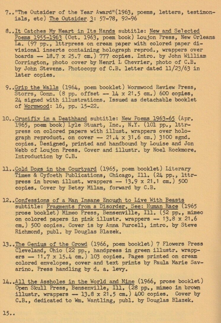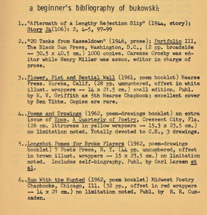 This issue also featured a "A Beginner's Bibliography" for Bukowski, listing all his books to date.