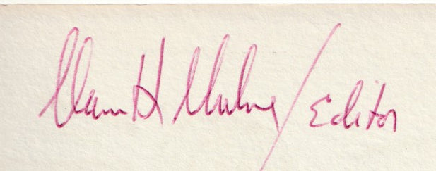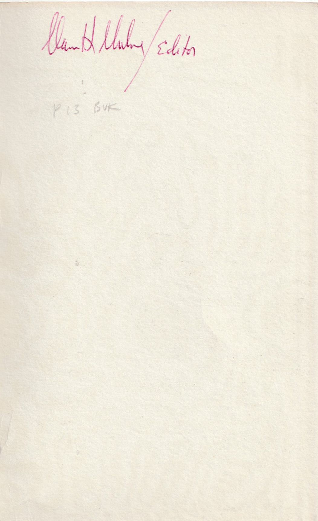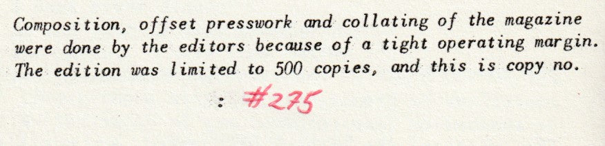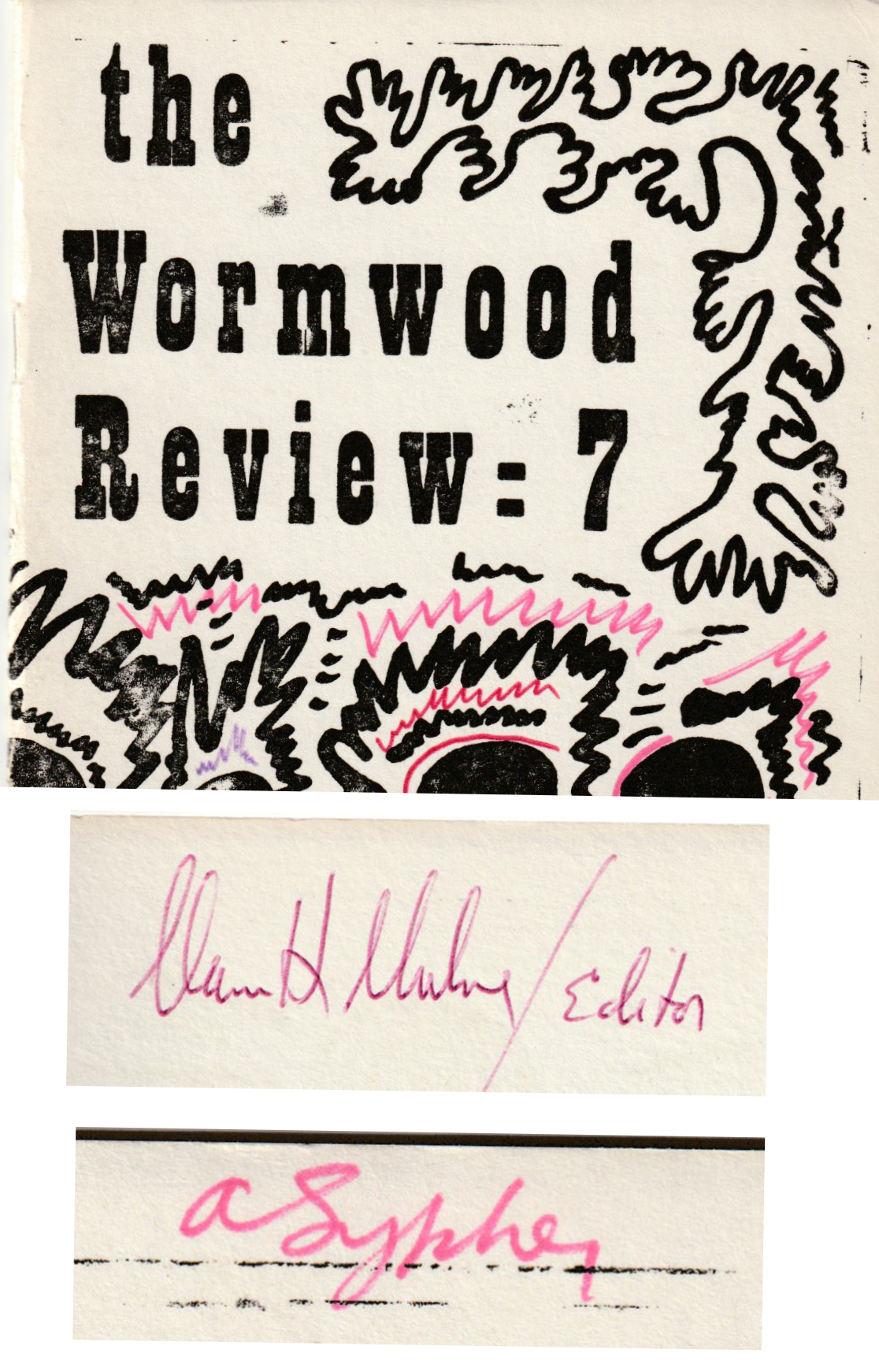 This copy is signed “Malone Maolone/Editor” on the inside rear cover. Maone was also the Cover Designer for Wormwood Review using the pseudonym, A. Sypher. This copy also has his A. Sypher signature on the top of the rear cover.