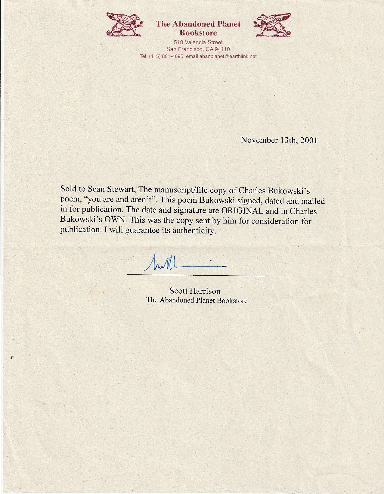 The letter of authenticity comes from Scott Harrison of Abandoned Planet Bookstore. Harrison was a friend of Martin’s and has a strong reputation among Bukowski collectors for selling authentic manuscripts.